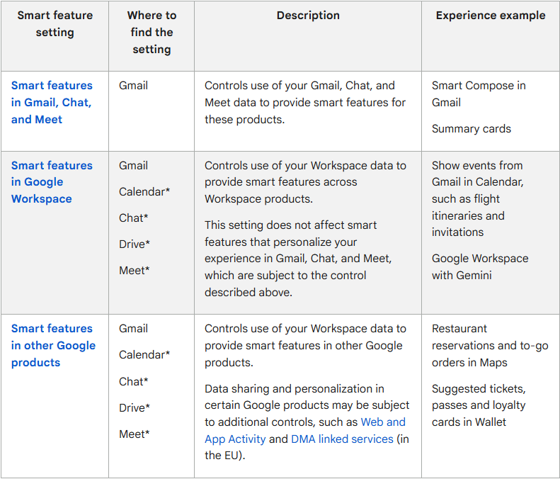 - The Google support page clarifies that with Smart Features in Gmail/Chat/Meet turned on, your content and activity may be used to personalize your experience, such as: Smart Compose in Gmail, Suggested Replies, summary cards, etc.