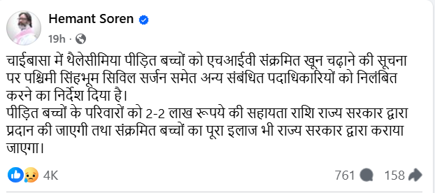 Chief Minister Hemant Soren has suspended the civil surgeon and several hospital staff, ordered a high-level probe, and directed an audit of all blood banks across Jharkhand to be completed within five days. Each affected family will receive Rs 2 lakh in compensation, along with full support for medical treatment. The state health directorate is re-examining all blood stocks and has restricted the blood bank’s operations to emergencies while deficiencies are addressed.