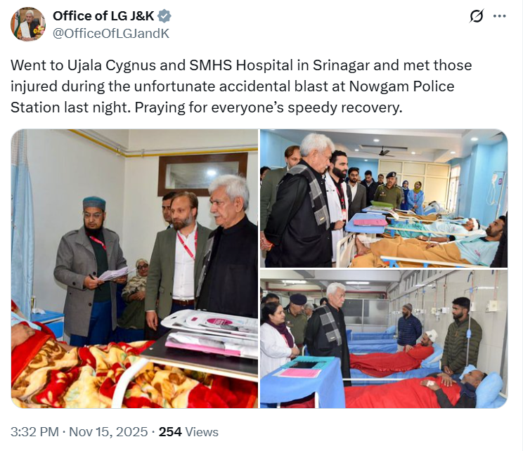 Mr Sinha also met the injured at Ujala Cygnus and SMHS Hospital in Srinagar. Sharing pictures from his meeting, he said, “Went to Ujala Cygnus and SMHS Hospital in Srinagar and met those injured during the unfortunate accidental blast at Nowgam Police Station last night. Praying for everyone’s speedy recovery.”
