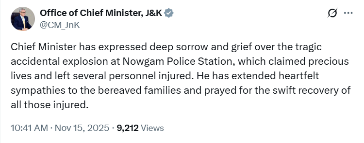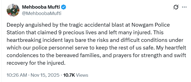 “Deeply anguished by the tragic accidental blast at Nowgam Police Station that claimed 9 precious lives and left many injured. This heartbreaking incident lays bare the risks and difficult conditions under which our police personnel serve to keep the rest of us safe. My heartfelt condolences to the bereaved families, and prayers for strength and swift recovery for the injured,” she said.