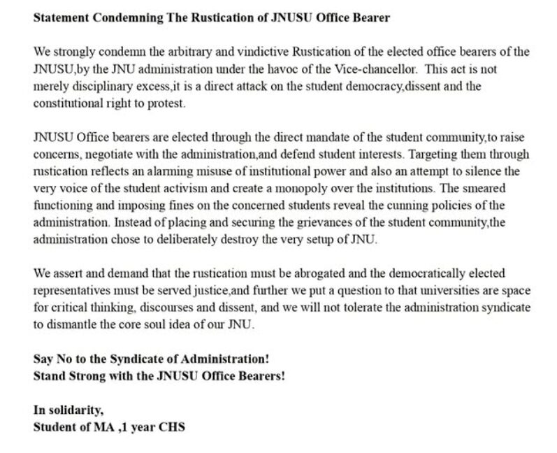 We encourage both the JNU administration and the student community to step back from the path of punitive escalation and move toward a dialogue rooted in empathy and mutual respect. Protecting a campus should mean protecting its democratic spirit as much as its physical infrastructure.