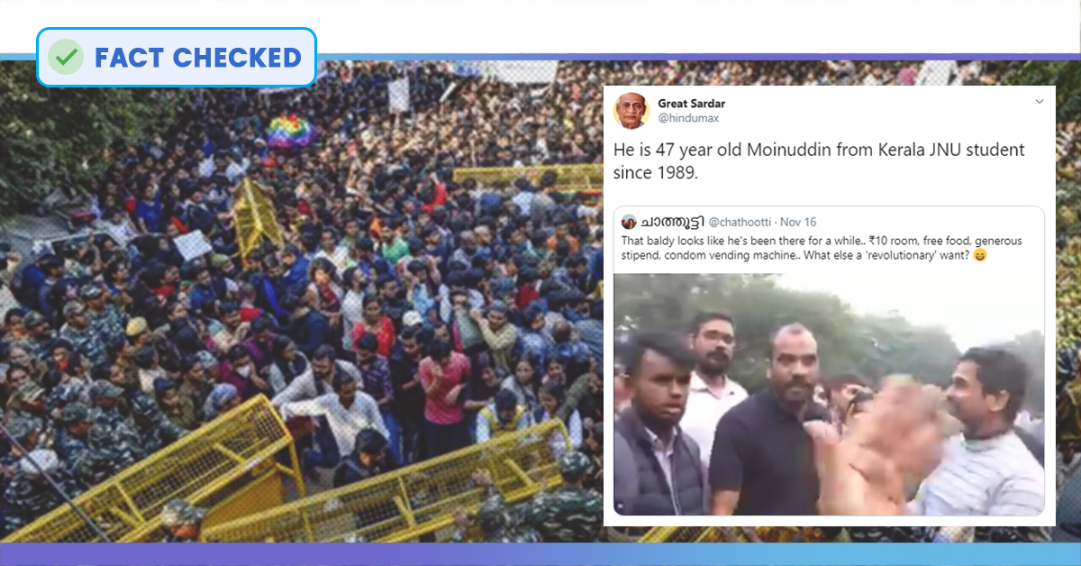 The person in the picture is not 47 years old Moinuddin from Kerala, but Pankaj Kumar Mishra, a 30-year-old from Uttar Pradesh who had taken admission in JNU this year. Previously, he was a student of Tata Institute of Social Sciences and had worked in in the health sector in rural Uttar Pradesh and Bihar and is currently pursuing his M.Phil in Social Medicine & Community Health from JNU.