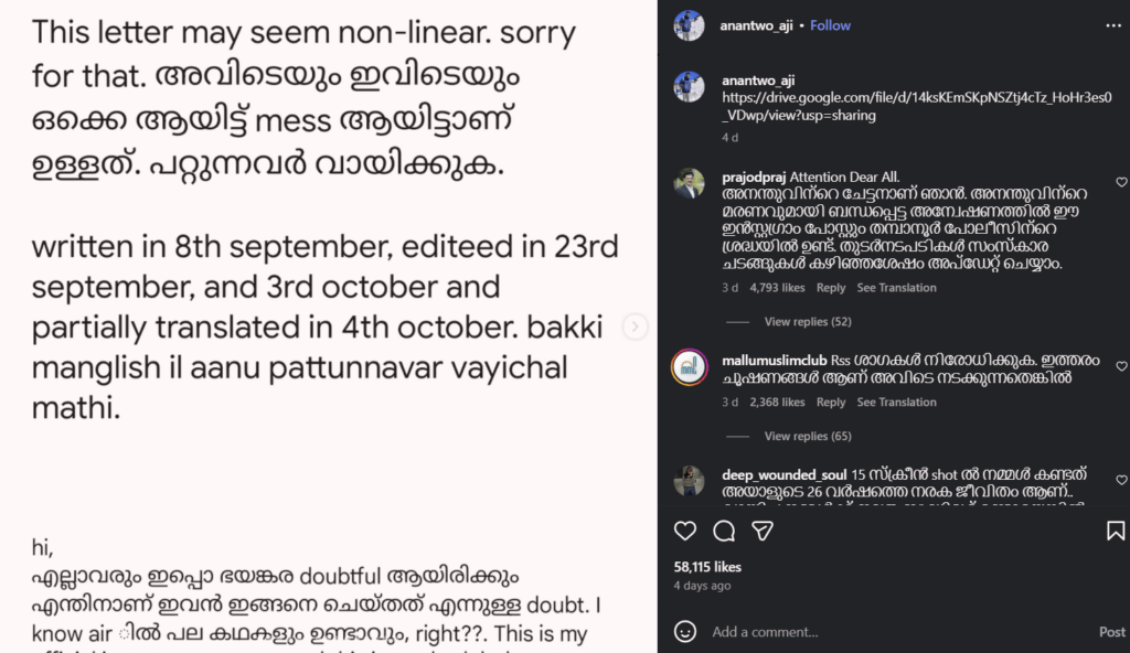 Anandu’s Instagram post detailed traumatic experiences of continuous sexual abuse and physical assault while attending RSS shakhas since childhood. He described how the abuse severely affected his mental health, causing anxiety and depression, leading to his decision to end his life, a decision he emphasised was unrelated to any financial or personal reasons.