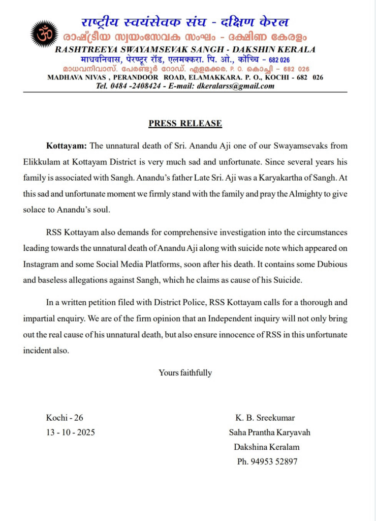 Anandu Aji, a 26-year-old software engineer from Kottayam, Kerala, was found dead by suspected suicide in a lodge at Thampanoor, Thiruvananthapuram, on October 9, 2025. Aji left a social media note alleging persistent sexual and physical abuse by members of the Rashtriya Swayamsevak Sangh (RSS) at their ‘shakhas’ (camps).