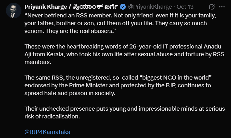 This case also highlights the need for robust mechanisms to handle abuse allegations impartially and support survivors. Concurrently, Karnataka Minister Priyank Kharge’s demand to ban RSS activities in government spaces has triggered heated reactions, including threats against him, underscoring the politically charged environment around the organisation’s perception.