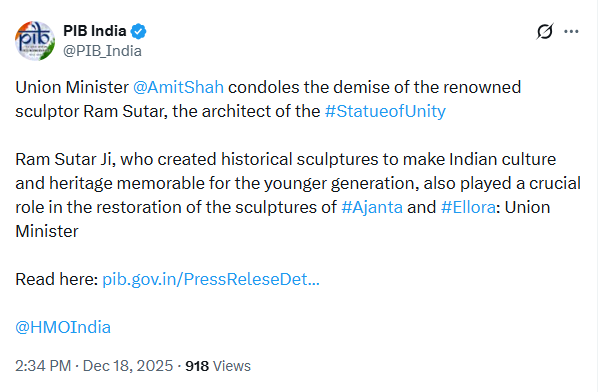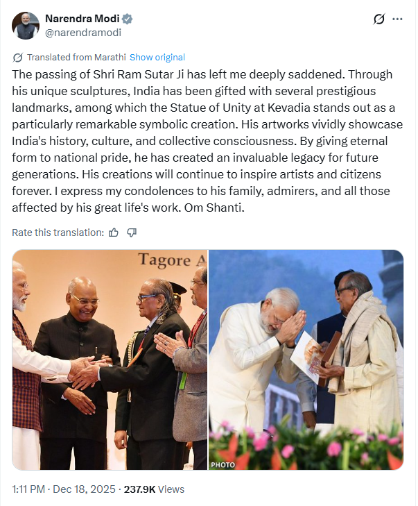 In a heartfelt post on X, the Prime Minister stated that Sutar’s works vividly showcase India’s history, culture, and collective consciousness.