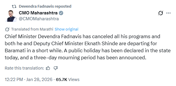 Deputy Chief Minister Eknath Shinde echoed these sentiments, referring to Pawar as an elder brother and a vital part of the state administration. The government has ordered the national flag to fly at half mast on all state buildings and cancelled all official entertainment through January 30.