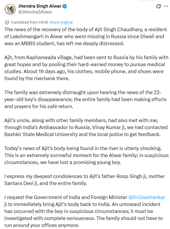 His sudden disappearance set off an anxious search operation involving his friends, university authorities, the Indian Embassy in Moscow, and local Russian law enforcement agencies. Posters with Ajit’s photograph circulated widely on social media, while his distraught family in Alwar made repeated appeals to both Indian and Russian authorities to intensify search efforts.