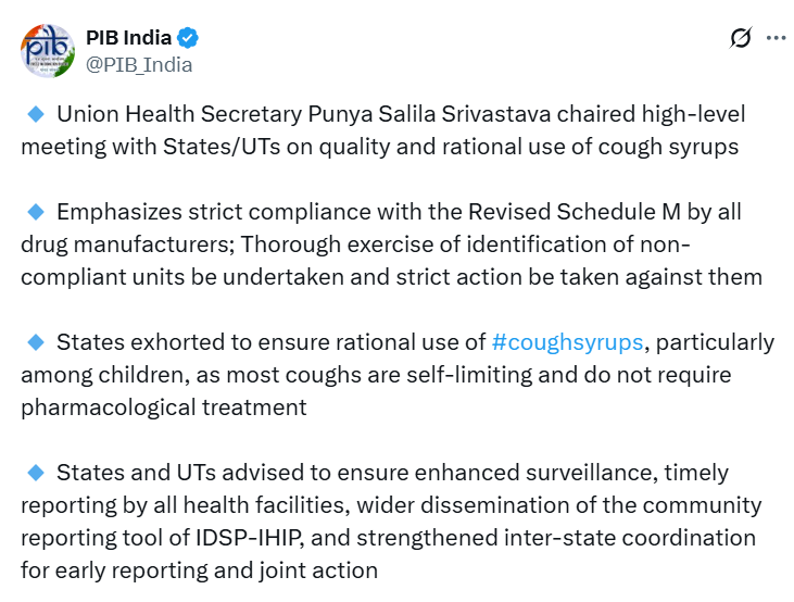 🔹 Union Health Secretary Punya Salila Srivastava chaired high-level meeting with States/UTs on quality and rational use of cough syrups