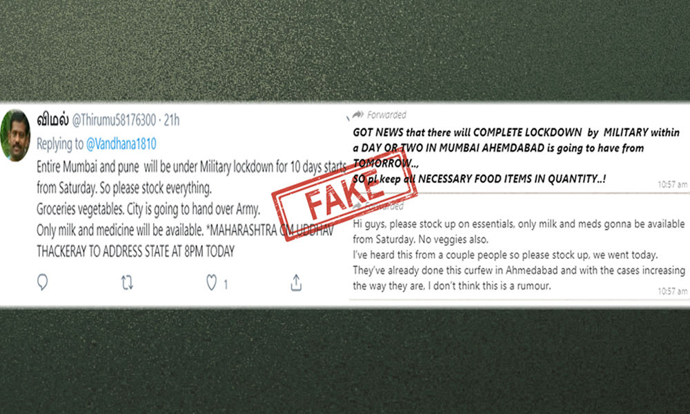 A message is being circulated on WhatsApp, Facebook and Twitter that claims that Mumbai and Pune will be under a military lockdown for a period of 10 days and only milk and medicine will be available.