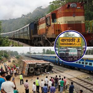 A speeding dumper lost control and crashed onto railway tracks near Barabanki, narrowly missing the passing Garib Rath Express train.