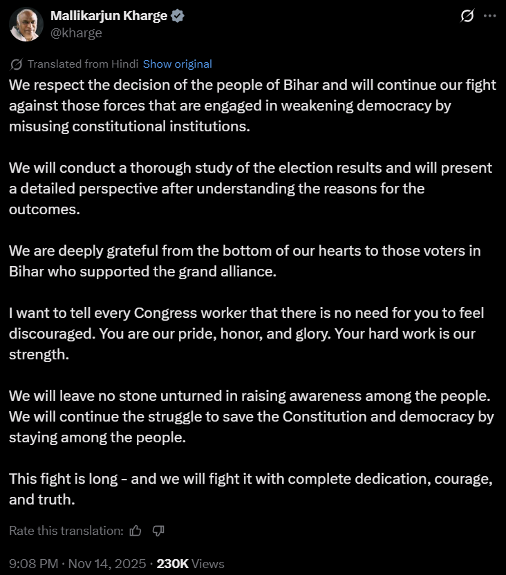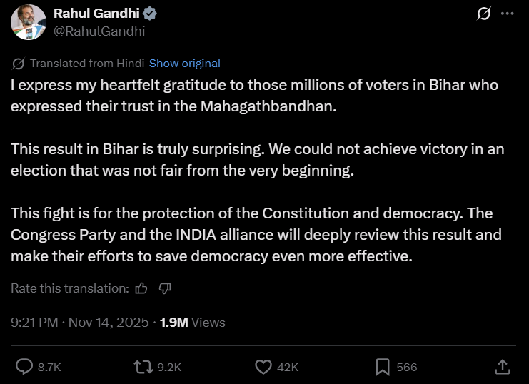 Rahul Gandhi described the Bihar election results as a setback but stressed that the Congress party and the INDIA alliance will rigorously analyse the outcome and strengthen their strategies. He thanked the millions of people who voted for the Mahagathbandhan despite facing an allegedly unfair election environment.
