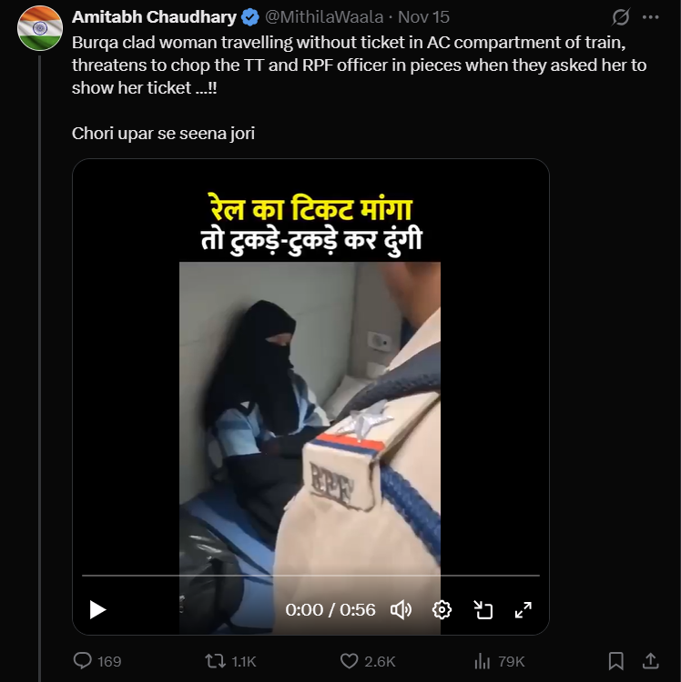A video showing a burqa-clad woman traveling without a ticket in an AC compartment, threatening to “cut into pieces” a Train Ticket (TT) and Railway Protection Force (RPF) officer when asked to show her ticket, went viral on social media platforms. The incident sparked widespread reactions and concern among viewers.