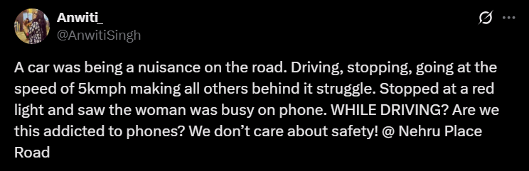 Another incident involved a car moving at a snail’s pace, stopping and starting at 5 kmph, causing traffic frustration. The passenger noticed the woman driver at a red light “busy on phone WHILE DRIVING.” The commuter lamented, “Are we this addicted to phones? We don’t care about safety”.