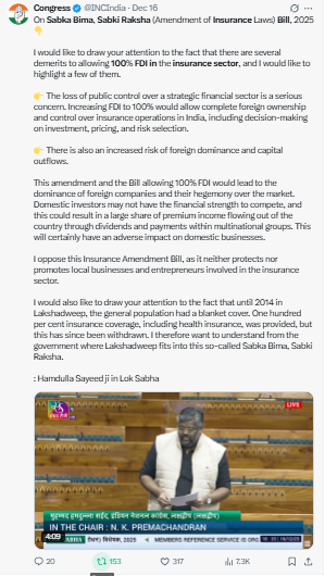- TMC’s Conditional Backing with Caveats (Derek O’Brien): TMC supported but voiced unease over “premium hikes for marginals.” O’Brien tweeted post-vote: “100% FDI? Fine, but cap foreign voting rights at 49% and enforce rural quotas-or it’s Bengal’s insurers first to fold.” They stressed mis-selling scandals, referencing 2023 IRDAI fines on 15 foreign-linked firms totalling ₹200 crore.