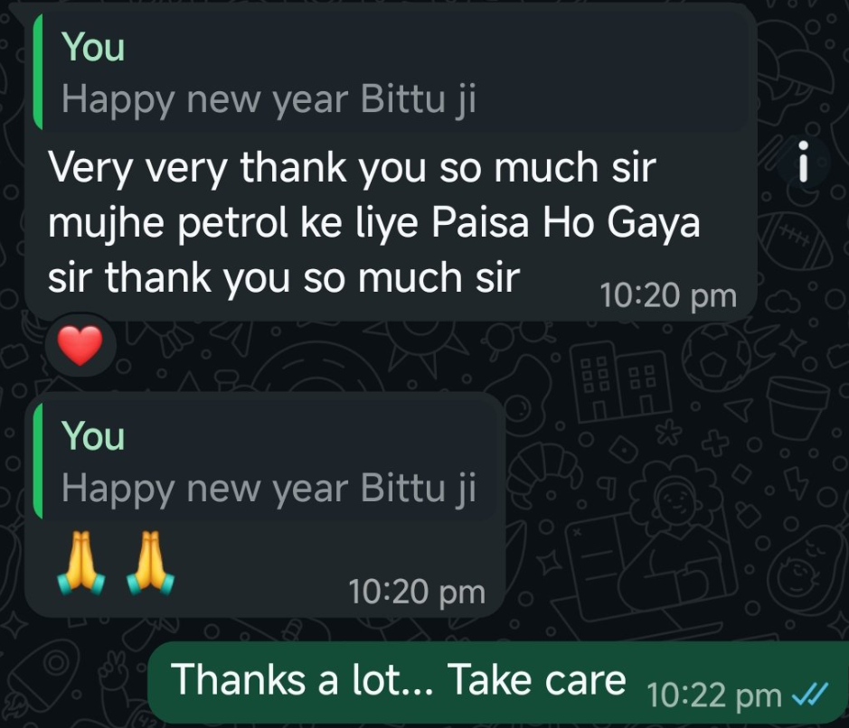 The story gained massive traction online after the customer shared a screenshot of their WhatsApp conversation. Bittu’s response was deeply moving; he thanked the customer profusely, noting that the ₹501 tip was enough to cover his petrol costs for the night.