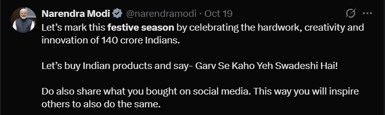 Prime Minister Modi urges Indians to support local artisans by buying Swadeshi products this festive season.