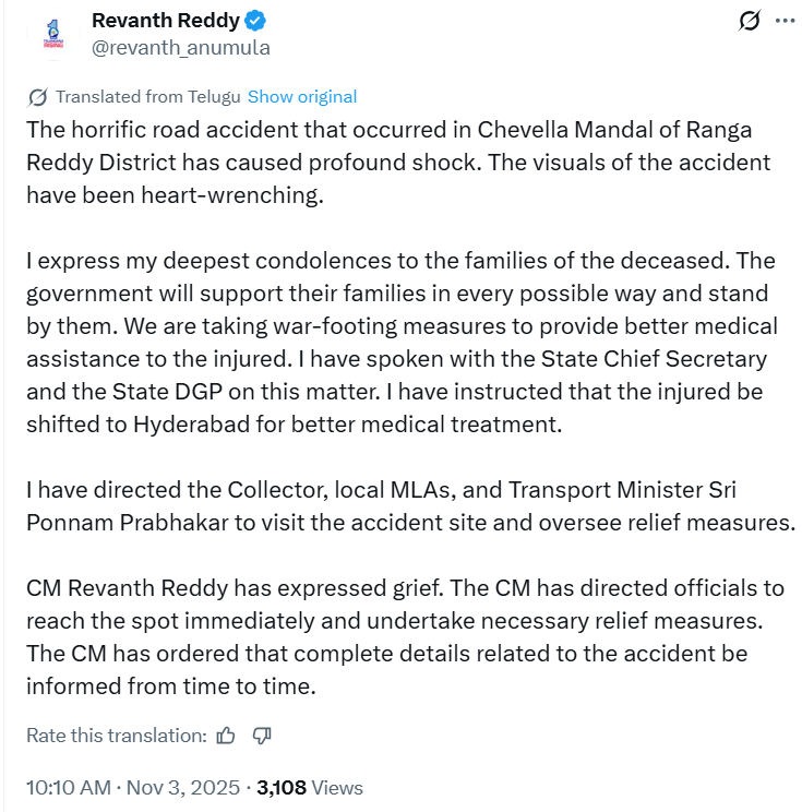 “I express my deepest condolences to the families of the deceased. The government will support their families in every possible way and stand by them. We are taking war-footing measures to provide better medical assistance to the injured. I have spoken with the State Chief Secretary and the State DGP on this matter. I have instructed that the injured be shifted to Hyderabad for better medical treatment. I have directed the Collector, local MLAs, and Transport Minister Sri Ponnam Prabhakar to visit the accident site and oversee relief measures,” said CM Reddy in a post on X.