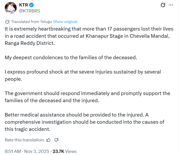Ministers and leaders have expressed shock and condolences to the families of victims and injured. “It is extremely heartbreaking that more than 17 passengers lost their lives in a road accident that occurred at Khanapur Stage in Chevella Mandal, Ranga Reddy District. My deepest condolences to the families of the deceased. I express profound shock at the severe injuries sustained by several people,” said KTR on X.