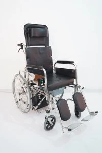 This reduces reliance on caregivers and maintains the user’s privacy and dignity. The wheelchair also features a reclining backrest adjustable up to 180 degrees, detachable handrests and legrests for customizable comfort, and rear wheel locks for safety.