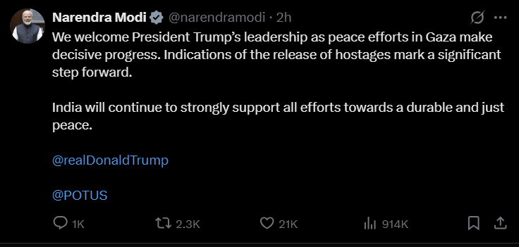 Prime Minister Narendra Modi has placed a spotlight on US President Donald Trump’s pivotal role in advancing the Gaza peace process, offering strong words of praise even before details of the breakthrough emerged publicly. In a statement posted on X, Modi said, “We welcome President Trump’s leadership as peace efforts in Gaza make decisive progress. Indications of the release of hostages mark a significant step forward. India will continue to strongly support all efforts towards a durable and just peace.”