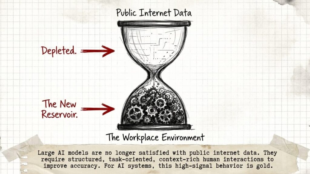 Large AI models are no longer satisfied with publicly available internet data. They now require nuanced, context-rich human interactions to improve accuracy. Workplace environments, especially within tech companies, offer precisely that, structured, task-oriented, high-signal human behaviour.
