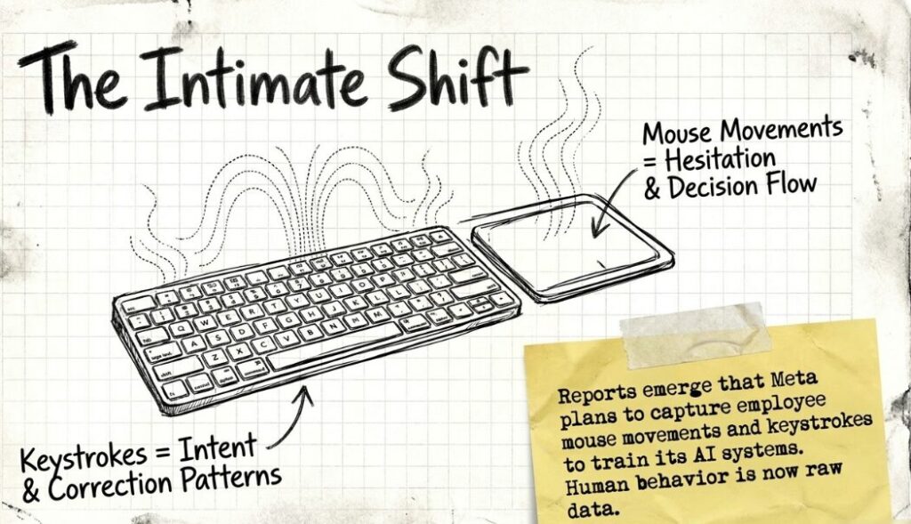 When reports emerged that Meta is reportedly planning to capture employee mouse movements and keystrokes to train its AI systems, it did not just signal a shift in internal policy. It revealed something deeper: the quiet normalisation of human behaviour as raw data, even within the workplace.