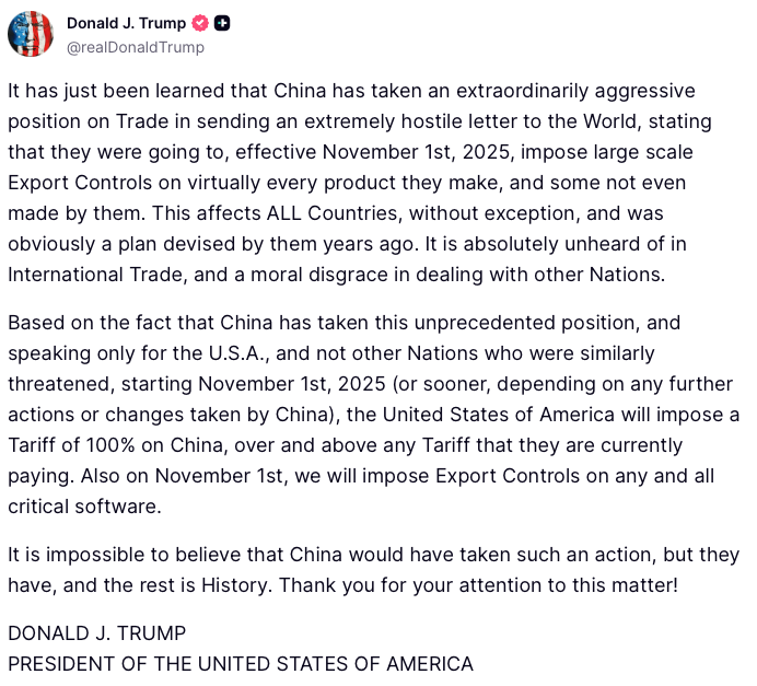 “It is absolutely unheard of in International Trade, and a moral disgrace in dealing with other Nations,” Trump said. Alongside import tariffs, he announced that, from November 1, strict export controls would apply to all critical software produced in the US, stressing that this decision followed China’s “plan devised years ago” and warning of firm American retaliation.