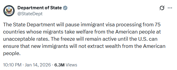 The US State Department announced an indefinite pause on immigrant visa processing on Wednesday for citizens of 75 countries, effective 21 January.