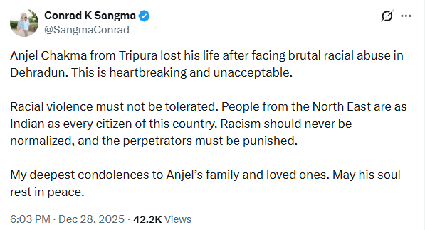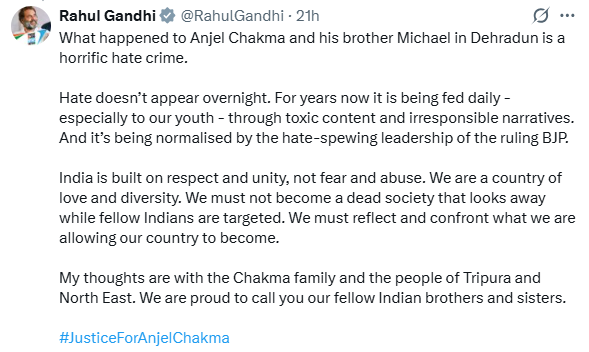 Anjel Chakma, a 24-year-old MBA student from Tripura, was killed in a racially motivated attack in Dehradun, Uttarakhand.