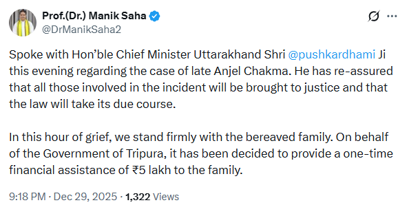 Tripura Chief Minister Manik Saha coordinated with Uttarakhand CM Pushkar Singh Dhami to ensure a rigorous probe, while the Uttarakhand government announced financial assistance of ₹4.12 lakh for the family.