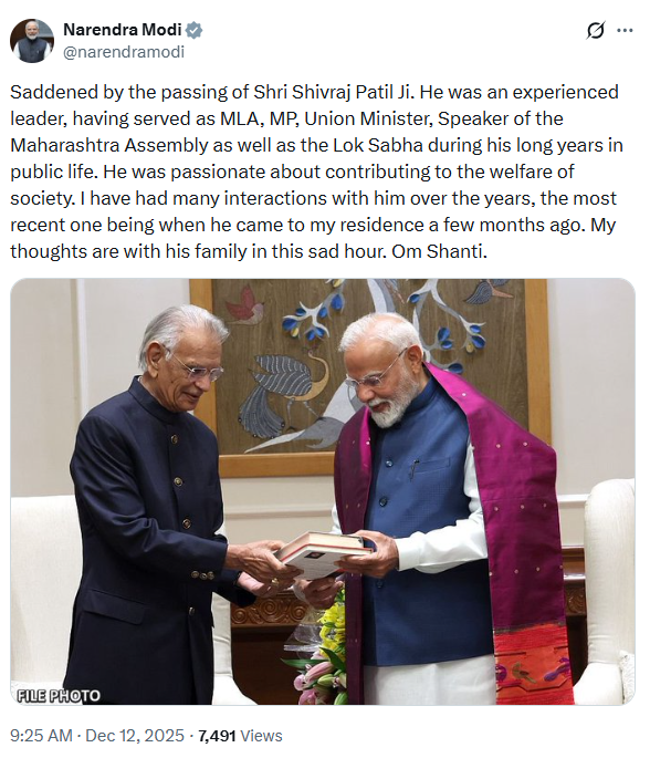 Prime Minister Narendra Modi was among the first to extend his condolences via X (formerly Twitter), acknowledging Shivraj Patil’s extensive service to the nation and the Congress party.