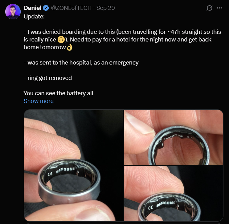 A popular tech influencer’s smart ring battery swells painfully mid-travel, causing emergency hospital care and missed flight.