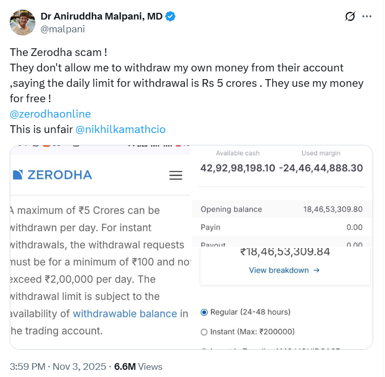 Zerodha, one of India’s leading stockbrokers, faced a viral social media allegation after Mumbai-based investor Dr Aniruddha Malpani claimed he was prevented from withdrawing over ₹42 crore from his account, citing a ₹5 crore daily withdrawal limit.