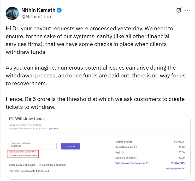 The post, made on social media platform X, sparked widespread debate, prompting immediate clarification from Zerodha’s CEO, Nithin Kamath, who assured the public that the withdrawal request had been processed and explained the policy’s purpose as a safety measure.